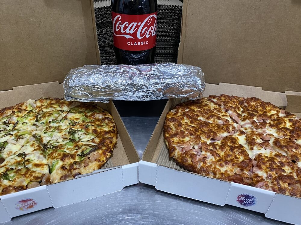 2 x Large Traditional pizza, Garlic bread, 1.25lit drink Gourmet pizza $2 extra