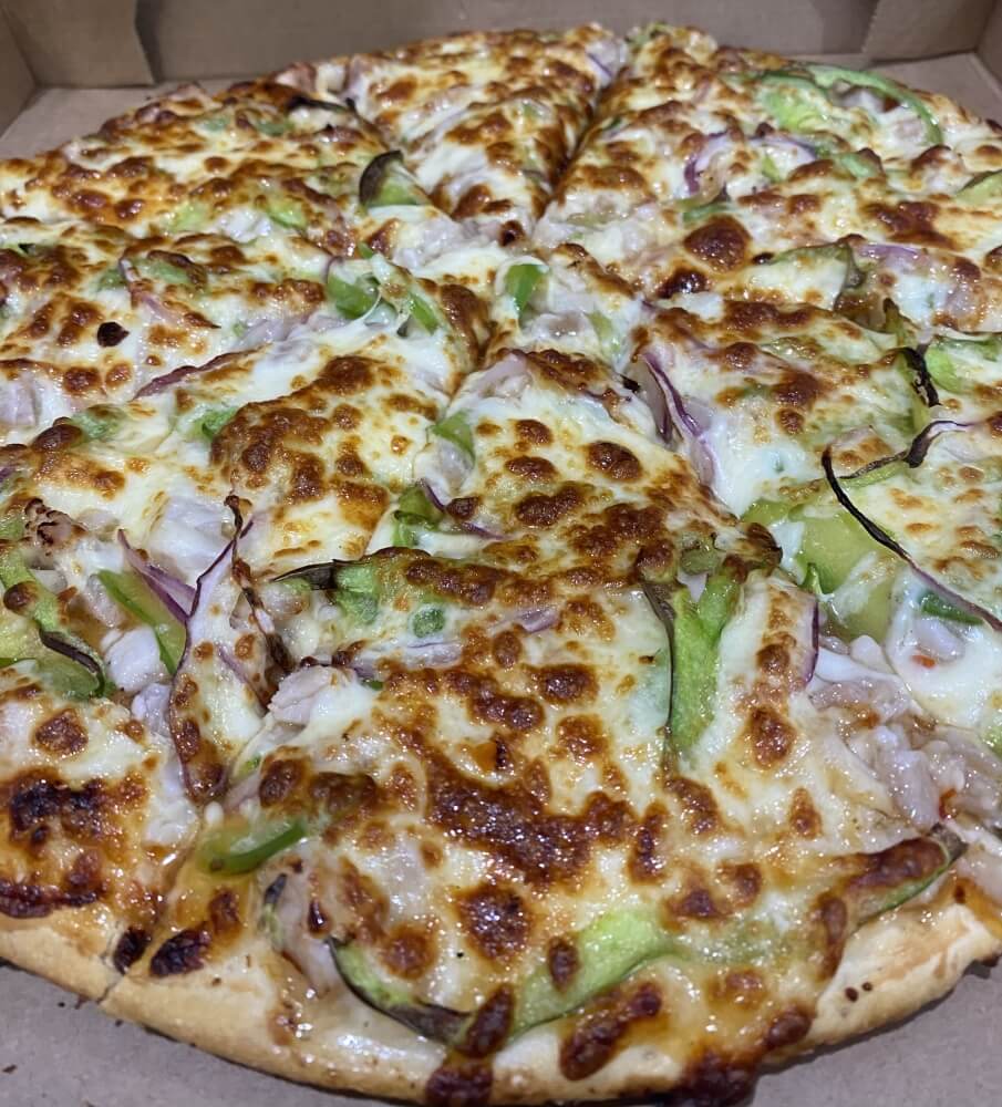 Roasted Chicken, Bacon, Capsicum, Pineapple & Onion on a BBQ sauce base