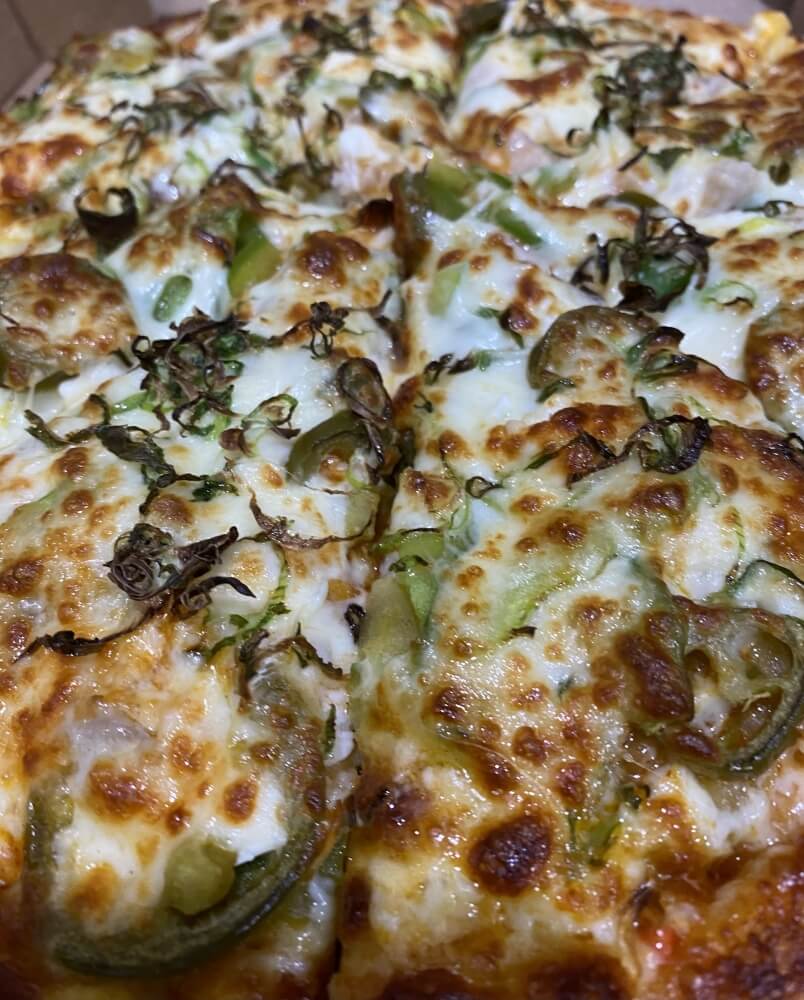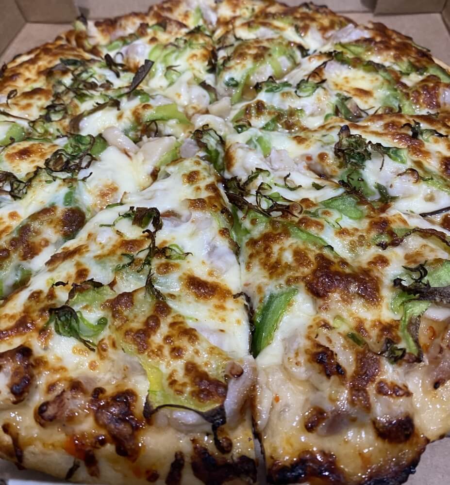 Roast Chicken with Cajun Herbs, Spanish Onion, Capsicum, Mushrooms & Jalapenos on a Red Pizza Sauce with Sour Cream Garnish
