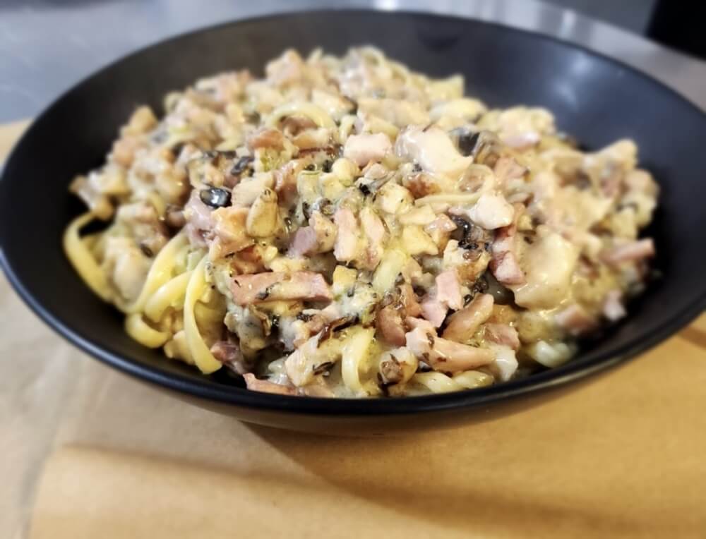 Chicken, Mushrooms, Bacon, Garlic & shallots in a Creamy Sauce with Linguine Pasta