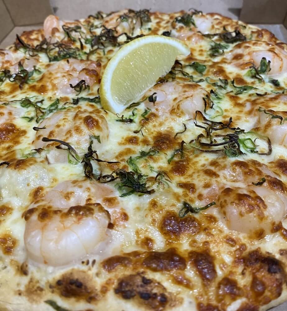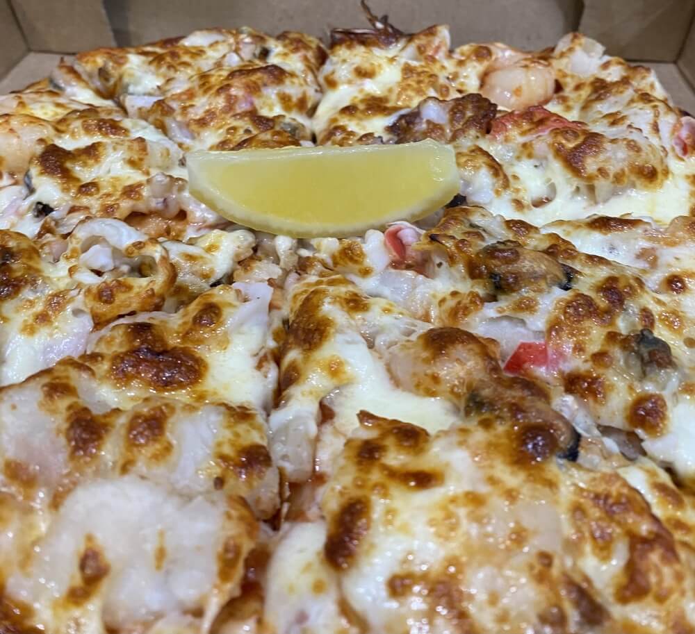A Medley of Prawns, Calamari, Octopus, Mussels, Fish Pieces & Seafood Flakes, on a Red Pizza Sauce Base Lemon Wedge Garnish