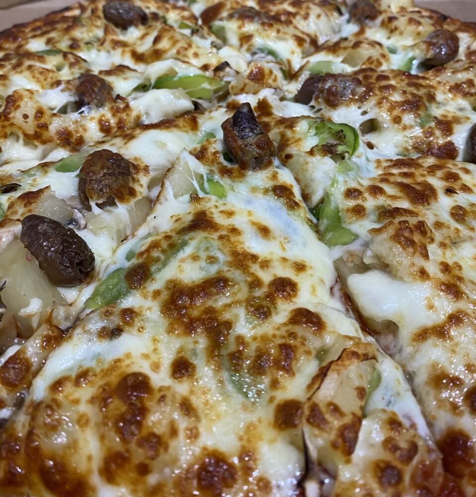 Mushrooms, Capsicum, Olives, Pineapple & Onion on a Red Pizza Sauce Base