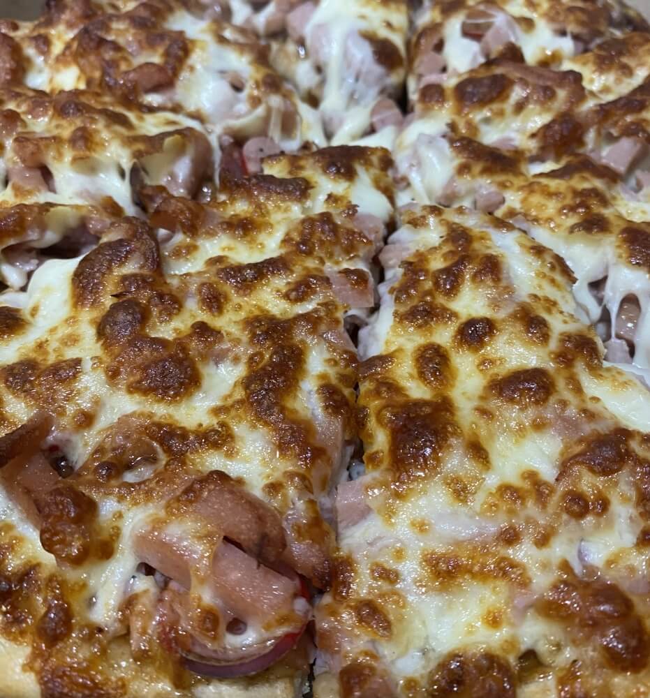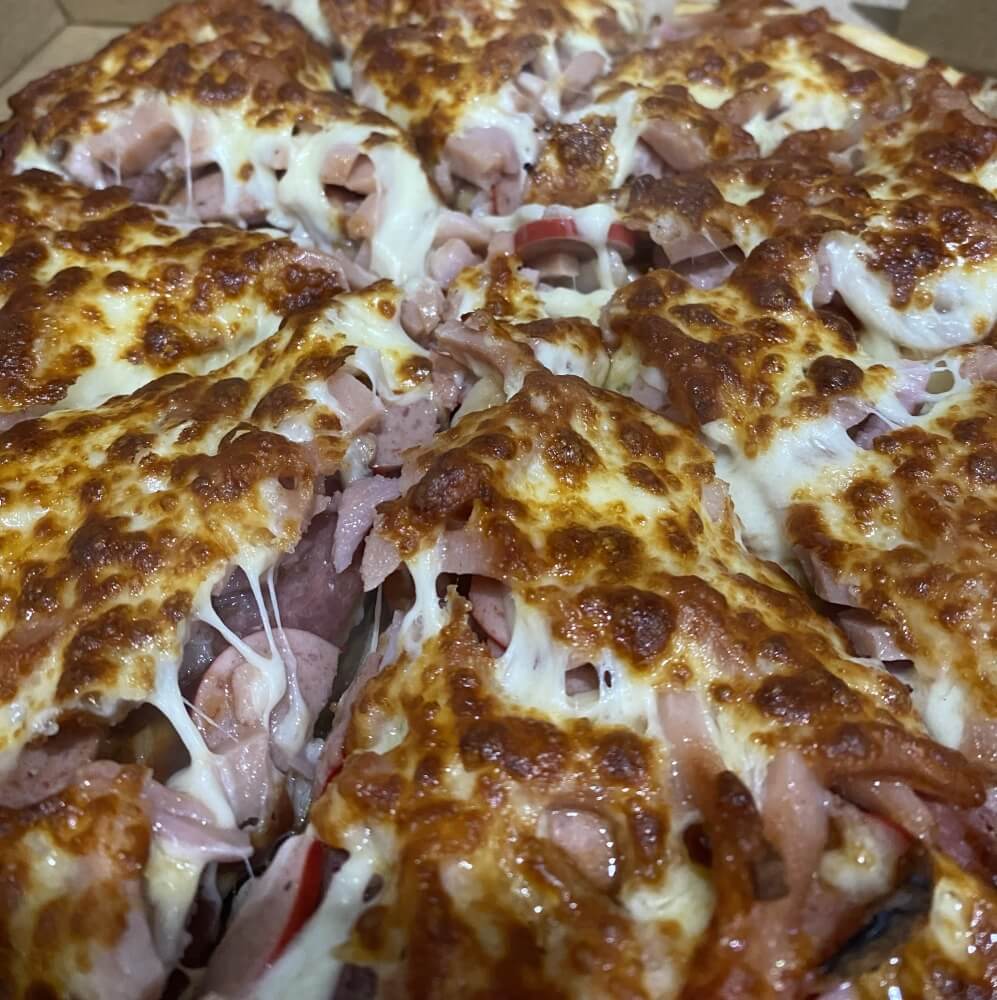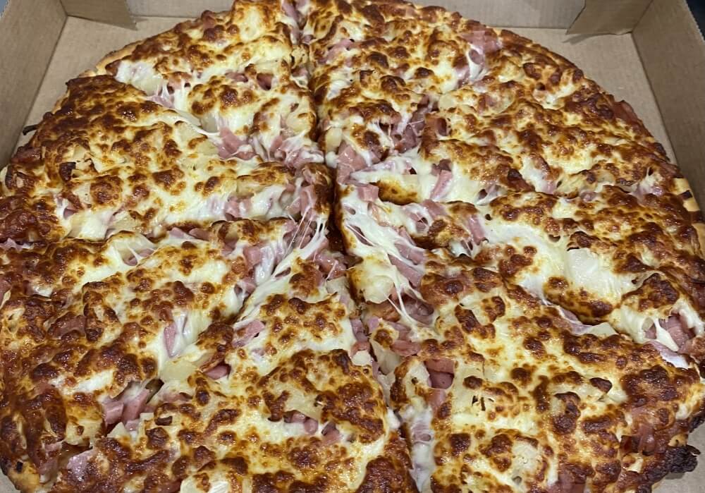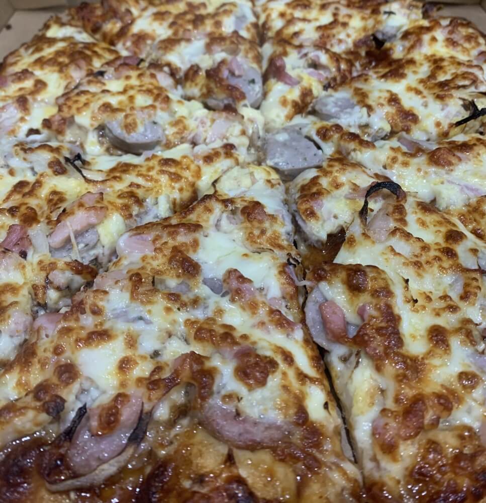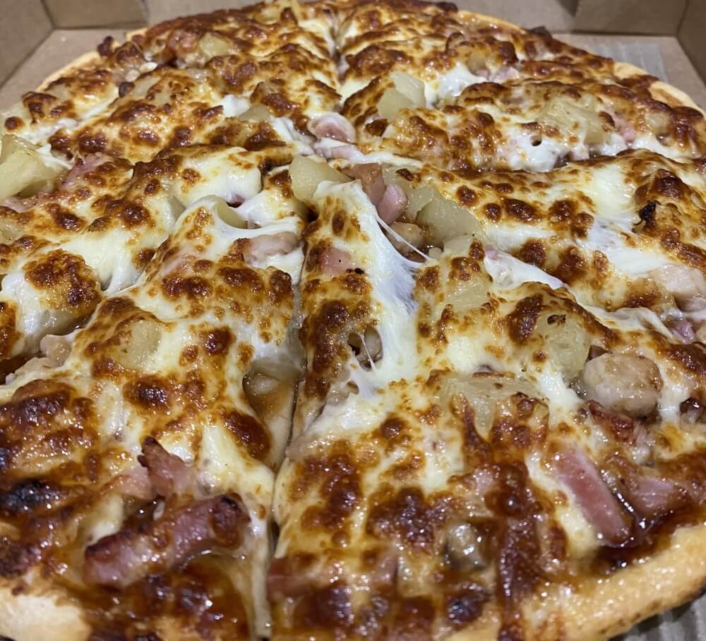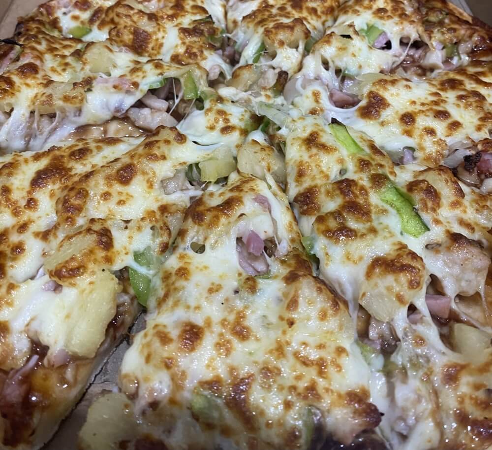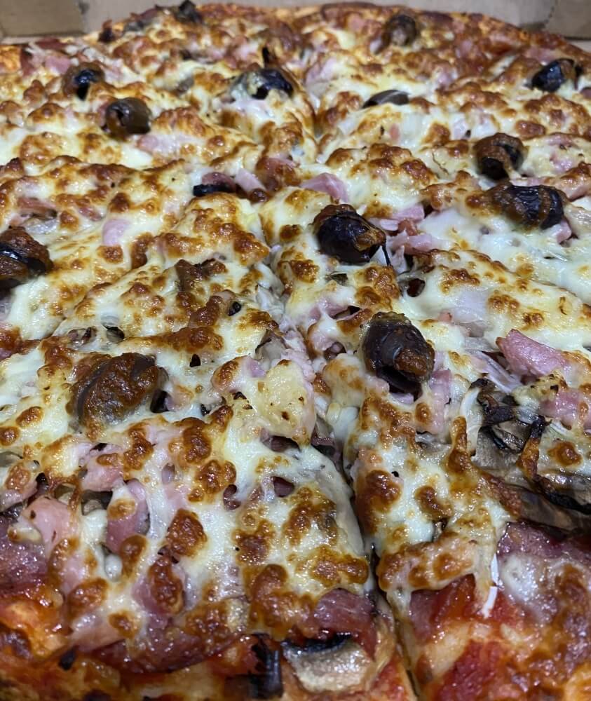 Ham, Cabanossi, Pepperoni, Mushroom, Capsicum, Onion, Pineapple & Olives on a Red Pizza Sauce Base
