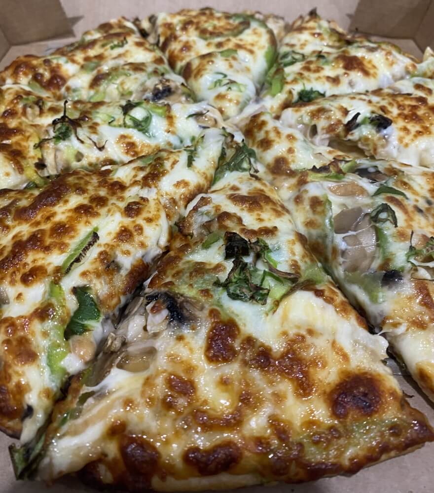 Chicken, Red Onion, Capsicum on a Satay & Sweet chilli sauce base (Cashews Optional)