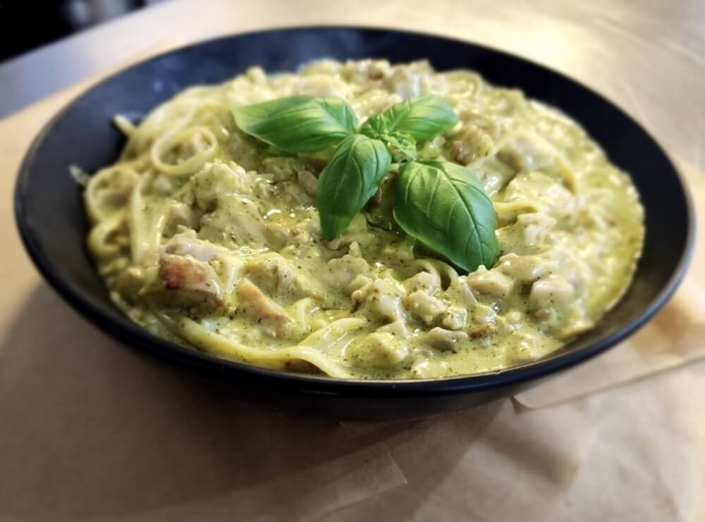 Chicken, Garlic, & Shallots in a Creamy Pesto Sauce with Linguine Pasta
