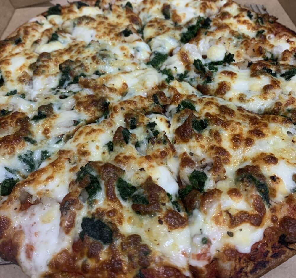 Roast Chicken, Spinach, Feta & Basil Flakes, with Garlic on a Red Pizza Sauce Base