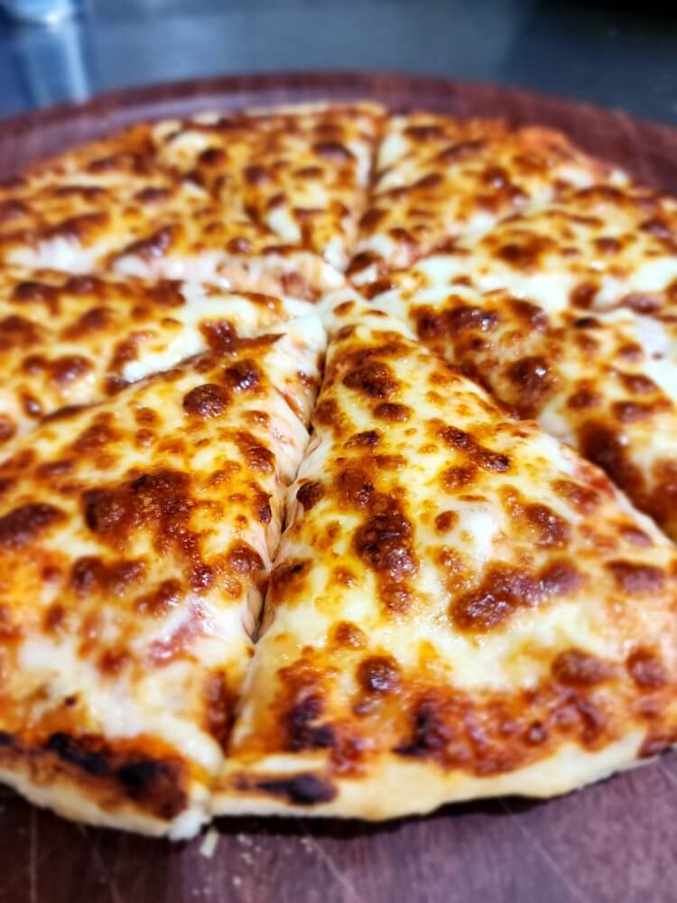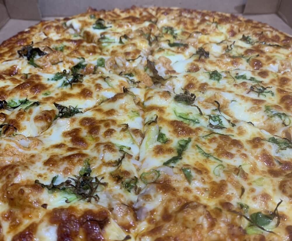 Red Pizza Sauce Base topped with Mozzarella Cheese Optional, you can choose BBQ Base
