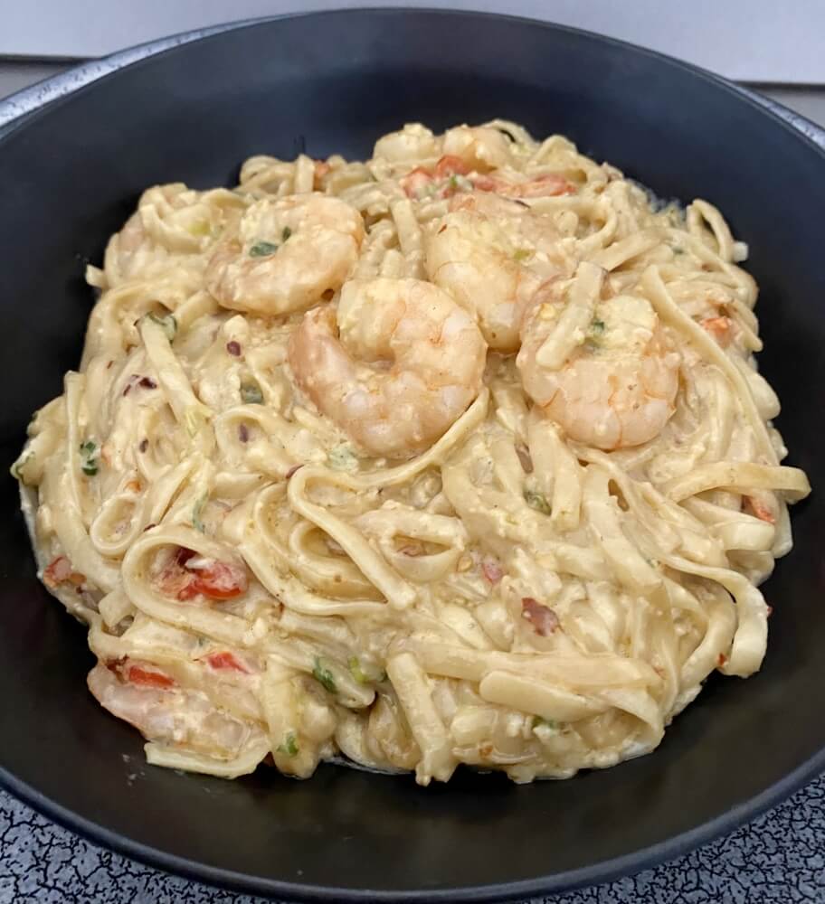 King Prawns, Red Capsicum & Shallots in a Delicious Creamy Garlic Sauce with Linguine Pasta (chilli optional)