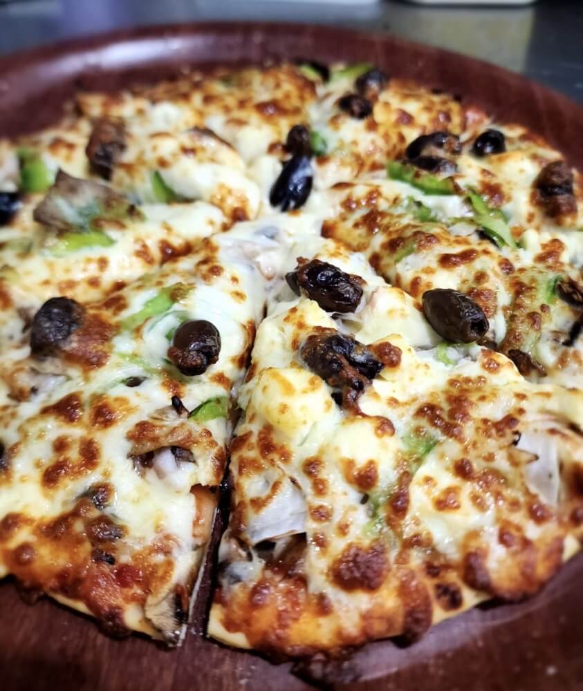 Chicken, Mushrooms, Onion, Capsicum, Olives & Feta on a Red Pizza Base